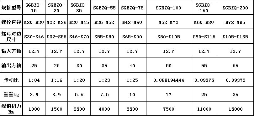 增力扳手性能特點:采用高效行星變速機構作為主傳動,體積小,重量輕,由于變速比大,輸入較小力量就能產生很大的輸出扭矩,反作用支腳可360o任意調換位置;操作人員只需施加很小的力,即可得到4-40倍的輸出力矩.配套扭力扳手根據傳動比預置好扭力,達到相應的預緊扭矩,能自動發出訊號“嗒”的一聲報警,同時伴有明顯的手感振動,從而輕捷的完成螺栓螺母的緊固拆卸工作。?